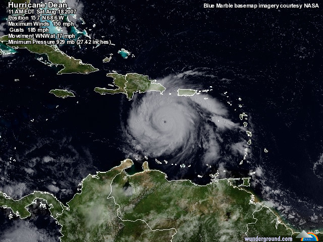 Oko hurikánu se pohybuje zhruba 32kilometrovou rychlostí. Na pevnou zem Dean vpadl ráno místního času v blízkosti