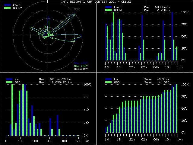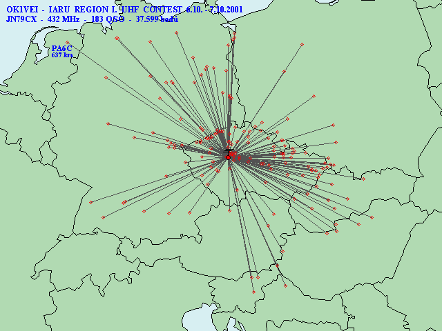 Po delší dobì závod na mojí znaèku - první z našeho nového "domácího" QTH v JN79CX. Vybavení základní - na 432MHz 100W a 27 el. M2, na 1296 MHz 10W a 140cm parabola. Závod jsem si docela užil - na 432 MHz není 8. místo ze 428 m.n.m. špatné. Na 1296 MHz nešlo s 10W na stole dìlat žádné zázraky - velmi potìšilo QSO s DF0TEC/p z JO73CF.
